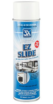 One of the major concerns for RV enthusiasts using their units during the cold weather seasons is the possibility of the seals around the slide-out sections being damaged. 3X Chemistry makes a product called Easy Slide, using PTFE technology that keeps your slide-outs operating smoothly – it repels moisture and inhibits corrosion as it protects with a lubricating barrier. Non-greasy and free of chlorinated or fluorinated solvents, it is the ideal addition to your roster of RV maintenance product.